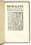 MORALITÉ nouvelle du mauvais Riche et du Ladre. — À douze personnages. — Sans lieu ni date [Aix, Augustin Pontier, 1823]. — Plaquette in-8 de 16 ff.n.ch. : maroquin bleu nuit à long grain, encadrement dessiné par des filets et des fleurons...