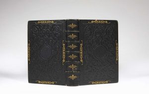d'imprimer) : maroquin noir, large plaque à froid à motifs de ferronnerie agencés autour d'un médaillon ovale laissé en réserve au centre, large fer doré au milieu de chaque bord, dos orné, fleuron doré répété dans les caissons, dentelle intérieure, doublure et gardes de soie brochée, tranches dorées sur marbrure (Marius Michel).
