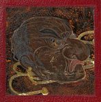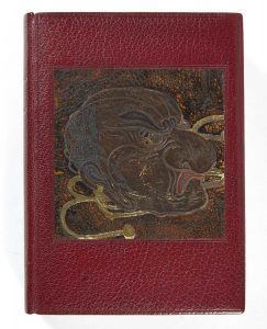 TRÈS CURIEUSE RELIURE ORNÉE D'UN CUIR JAPONAIS INCISÉ ET PEINT REPRÉSENTANT UN MASQUE DE THÉÂTRE NÔ.
