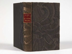 LOTI (Pierre). — La Hyène enragée. — Paris, Calmann-Lévy, sans date [1916]. — In-12, 4 ff.n.ch. et 296 pp. : cartonnage de soie bleu nuit, décor brodé de fils métalliques sur les plats et passant sur le dos, pièce de titre rouge au dos,...