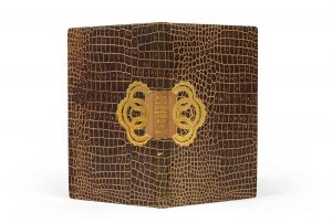 de titre beige débordant sur les plats et flanquée de deux motifs trilobés dorés, tête dorée, non rogné, couverture et dos (René Kieffer).