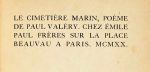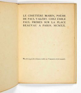 VALÉRY (Paul). — Le Cimetière marin, poème. — Paris, Émile Paul frères, 1920. — In-8 carré, 1 f. blanc, 8 ff.n.ch. et 1 f. blanc : bradel dos de maroquin olive, plats de plexiglas poli, filets maigre et gras en encadrement, tête dorée,...
