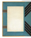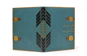 bordant les plats, avec deux pièces de maroquin mosaïqué et gaufré "petits carrés" agrémentées d'une pastille ornementale évoquant deux lanières d'attaches, dos lisse portant le titre doré et orné en tête et queue de 4 gros chevrons mosaïqués noir se prolongeant sur les plats, large encadrement intérieur de maroquin de même couleur orné des mêmes motifs, doublure et gardes de toile de jute, doubles gardes de papier marbré, non rogné, couverture et dos, chemise demi-maroquin et étui (Pierre Legrain).