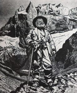 Le Vainqueur de la Meije. 1935. Bois gravé, 39 x 49 cm (à vue). Encadré. Tirage spécial : cette gravure est d'une dimension très supérieure à celle publiée dans l'album Montagnards : l'empreinte du bois fait ici 42 x 34 cm, alors que celle de l'album est de 26 x 21 cm.
