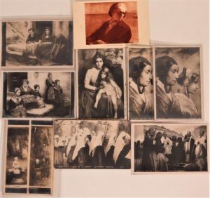 Lot de 9 cartes postales. Éditions SIP, 1901-1902. 8 cartes (dont une en double) de la série des Études en Tarentaise exposées aux Salons de 1901 et 1902, dont une en double, et une carte postérieure intitulée "La Sonate au clair de lune". 4 cartes avec une mention manuscrite de l'époque côté image, une carte (double) avec un timbre et cachet d'oblitération côté image. Les cartes illustrées des dessins de Coppier au début du XXe siècle sont rares.