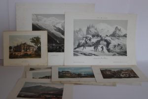 - Sallenches et Vue du Mont Blanc prise de la route de Chamouny, par Deroy (2 lithographies en couleurs, 15 x 19 cm, rousseurs)