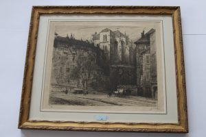 Le Chevet de la Sainte Chapelle - Chambéry. 1921. Eau-forte. 34 x 42 cm (à vue). Encadrée (cadre doré et mouluré). Tirage de 10 exemplaires numérotés et signés par l'artiste (N° V/X). Cette grande eau-forte représente la Sainte-Chapelle vue de la place du Château à Chambéry.
