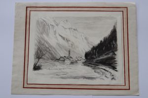 Les Brévières. 1936. Dessin original crayon, lavis et encre de chine. 20 x 25 cm. Contrecollé sur papier fort, avec encadrements à l'encre brune. Ce dessin original a servi pour l'eau-forte éponyme de l'album Au seul des Alpes de Savoie. Signé par l'artiste.