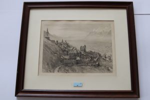Conflans. 1935 (vers). Eau-forte en couleurs. 17 x 27 cm (à vue). Encadrée. Signée en marge par l'artiste. Cette eau-forte, non répertoriée par Beccatini, représente Conflans et la Combe de Savoie ; une vue proche de celle parue dans l'album Au seuil des Alpes de Savoie, mais en un peu plus petite et avec quelques différences.