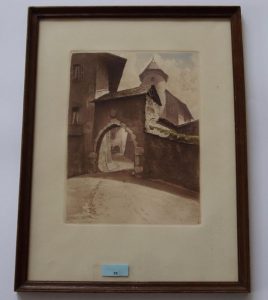 Conflans. La Porte de Savoie. Comité d'Albertville des fêtes du rattachement de la Savoie à la France, Albertville, 1960. Eau-forte en couleurs. 37 x 28 cm (à vue). Encadrée. Extraite de l'album Conflans.