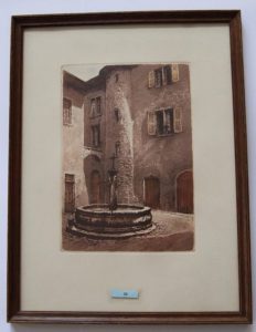 Conflans. Fontaine Louis XIV. Comité d'Albertville des fêtes du rattachement de la Savoie à la France, Albertville, 1960. Eau-forte en couleurs. 37 x 28 cm (à vue). Encadrée. Extraite de l'album Conflans.
