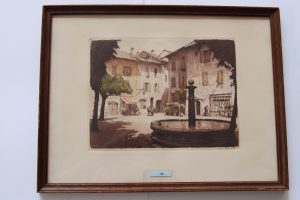 Conflans. La fontaine Louis XV et la Place. Comité d'Albertville des fêtes du rattachement de la Savoie à la France, Albertville, 1960. Eau-forte en couleurs. 37 x 28 cm (à vue). Encadrée. Extraite de l'album Conflans.