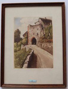Conflans. La Porte Tarine. Comité d'Albertville des fêtes du rattachement de la Savoie à la France, Albertville, 1960. Eau-forte en couleurs. 37 x 28 cm (à vue). Encadrée. Extraite de l'album Conflans.