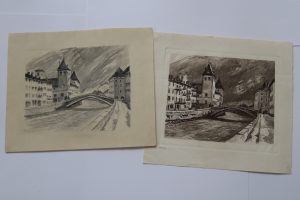 On joint, du même : Moutiers Déc-35. Didier et Richard, Grenoble 1936. Eau-forte. 26 x 27,5 cm. Le tirage est de 400 exemplaires. Extrait de l'album Au seuil des Alpes de Savoie. Bel état.