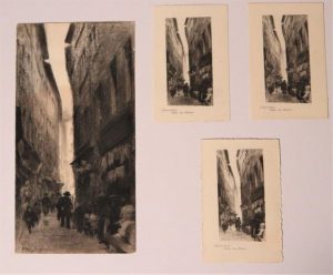 Chambéry : rue du Sénat. 1937. Dessin original au fusain. 27 x 14 cm. Dessin original ayant servi à l'illustration de l'ouvrage de Gabriel Pérouse Le Vieux Chambéry. Il en a été donné ultérieurement des cartes postales ; on en joint 3 exemplaires.