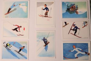 Série de 10 cartes postales. Éditions Jansol, Chambéry, 1951. 10 reproductions d'aquarelles, non numérotées, avec une légende en caractères cursifs : Le débutant ; l'école des filles ; le bonheur des purs ; Et zut ! Pour le métro ! … ; Complet ; Job le choucas : - Comment ! Encore vous ! … ; le Bon Dieu n'est pas gentil ; On ne meurt qu'une fois ; l'école des garçons ; le monsieur qui prépare le chamois.