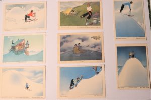 Série de 23 cartes postales (sur 28). Éditions Folklores et Provinces de France (EFPE), Chambéry, 1956-1961. 23 reproductions d'aquarelles, numérotées au dos, avec une légende en 3 langues. Les 8 cartes supplémentaires de cette série sont : 21- Le sexe faible ; 22- le réchaud perfectionné vient de s'éteindre pour la 17e fois ; 23- L'orage ; 24- Suivez le guide ; 25- C'est terrible ! à la place de la tente il y a une vache qui broute ! ; 26- Conséquence d'une faute de carre ; 27- 8 heures du soir... et toujours pas d'emplacement ; 20- Le demi-tour sur place, ou la suite dans les idées.