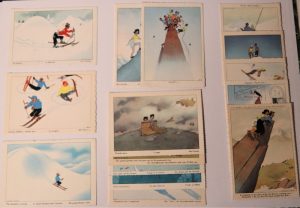 Série de 21 cartes postales (sur 28). Éditions Folklores et Provinces de France (EFPE), Chambéry, 1956-1961. 21 reproductions d'aquarelles, numérotées au dos, avec une légende en 4 langues (l'anglais ou l'italien au verso).