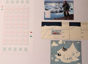 On joint également la carte de vœux des Amis de Samivel pour 2007 avec un dessin aquarellé extrait de l'album de Samivel Ayopork et Ayounghila . Samivel a participé en 1948, en tant que cinéaste et photographe, à la première expédition organisée par les Expéditions polaires françaises créées et dirigées par Paul-Émile Victor. Cette expédition a utilisé des chenillettes oranges provenant des surplus de l'armée américaine, qui ont été décorées par Samivel d'un petit dessin animalier à l'avant que l'on devine sur le timbre Groenland. Rare ensemble.