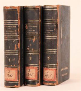 Notice sur les systèmes de montagnes. Chez P. Bertrand, Libraire-éditeur, Paris, 1852. 3 vol. in-16, reliure demi-basane, dos à faux nerfs (reliure de l'époque, frottements, cachet doré du Dépôt Général de la Marine sur le premier plat, annulé sur la page de titre). X + 1543 pp. (pagination continue). Illustré de 5 planches hors-texte (3 cartes sur double page, 1 tableau sur double page et une carte dépliante). Première édition. Ouvrage de référence sur l'histoire de la formation des montagnes. Rare.