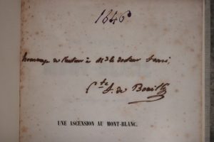 Une ascension du Mont-Blanc. Édité par l'auteur, Nantes, 1846. 1 vol. in-8, reliure pleine toile récente. Étiquettes en cuir sur le plat et sur le dos. 29 pp. Le comte Fernand de Bouillé, ardent légitimiste et admirateur de la haute montagne, a réussi l'ascension du Mont-Blanc en 1846 et surtout la première ascension de l'Aiguille du Midi en 1856 (par ses guides, lui-même s'étant arrêté 50 m sous le sommet). Tirage privé, envoi autographe signé de l'auteur.
