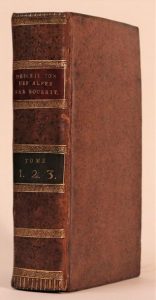 Nouvelle description des glacières, vallées de glace et glaciers qui forment la grande chaîne des Alpes de Savoie, de Suisse et d'Italie. Chez Barde, Manget et comp., Genève et se trouve à Paris chez Buisson, 1787. 3 tomes en 1 vol. in-8, reliure plein veau, dos lisse orné, pièces de titre, tranches jaunes (reliure de l'époque). XVI + 308 pp., 244 pp. et 282 pp. : les tables des trois volumes sont regroupées en fin de tome 3. Illustrée d'une grande carte dépliante et de 13 planches hors-texte, gravées par A. Moitte d'après les dessins de l'auteur.