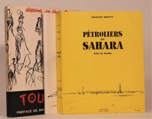 On joint : BROUTY (Charles). Pétrole du Sahara. Suite de dessins, Éditions Baconnier, Alger, 1958. 1 vol. in-4, broché, avec suite sous couverture illustrée, le tout sous étui. Illustré très nombreux dessins de Charles Brouty, dont deux lithographies en couleurs. Première édition, tirée à 1000 exemplaires. Celui-ci un des quelques exemplaires hors commerce réservé à l'auteur et ses collaborateurs, enrichi d'une suite comprenant le dessin de la lithographie n°2 mis en couleurs au crayon par l'artiste et 13 états de cette lithographie avec différents essais de couleurs.