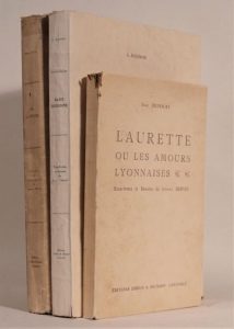 – DREVET (Joanny) et Jean DUFOURT. Laurette ou les amours lyonnaises. Éditions Didier & Richard, Grenoble 1929. 1 vol. in-8 broché. Non coupé. 132 pp. Illustré de 19 eaux fortes hors-texte dont 1 coloriée en frontispice et de 28 dessins dans le texte par Joanny Drevet. Première édition, collection "Cités, paysages". Texte de Jean Dufourt. Un bel ouvrage illustré par Drevet sur Lyon. Petit accroc et tache en haut du dos.