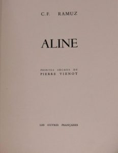 Aline. Les Œuvres françaises, 1945. 1 vol. broché, couverture rempliée. 81 pp. Illustré de 18 pointes-sèches de Pierre Vienot dans le texte. Tirage limité à 290 exemplaires ; celui-ci un des 135 premiers sur vélin d'Arches (n°54). Très bon état.