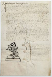 LÉOPARD. Parchemin de 1530 (22,5 x 15) signé «Paulus Leopardus de Colombarus» Signature dans le Cartouche d'un bois gravé représentant un étrange Léopard dressé; Un léopard, l'idéogramme de son nom de famille. Le graveur semble n'avoir jamais vu de léopard pour créer le modèle. Il relève plutôt du Bestiaire fantastique du Moyen âge. Également une calligraphie s'inspirant du léopard. Le parchemin commence par ces mots: «In nomine domini amen...». Texte en latin à étudier.