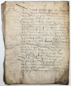 Devant Antoine DU PRAT Chevalier, Seigneur de NANTOUILLET (77), PRÉCY (77), ROSAY (77) et de FORMERIES, Baron de THOURY (77), Conseiller de Sa Majesté, son Chambellan ordinaire et Garde de la Prévôté de PARIS. TESTAMENT du 21 août 1574, de Noble homme Roger DE SARRIEU Capitaine de la garde du Roi en 1560, mestre de camp des vieilles bandes françaises en 1567. Gentilhomme de la chambre du roi en 1571. Il donne ses dernières volontés «étant prêts à partir de ladite ville pour s'en aller au Camp du Poitou ou son Régiment est pour le service du Roy».