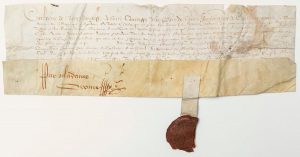 Parchemin (20 x 46) avec Sceau partiel appendu à ses armes. Petits défauts du temps.