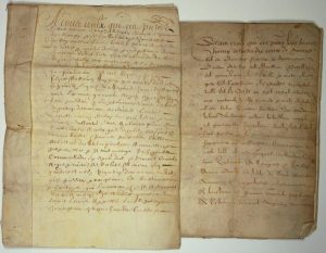 Devant Henry de LA CHASTRE (La Châtre), chevalier, Comte de NANÇAY et du BOUCHAIGE, Bailli et Gouverneur de la Ville et Comté de GIEN et Capitaine du Chastel de ladite Ville. Bail à titre de rente foncière annuelle à un Vigneron de Gien 1611. Cahier en parchemin de 11pp in-folio + Devant Séraphin LE BOSSU Seigneur de NANÇAY de, Bailli et Gouverneur de la Ville et Comté de GIEN et Capitaine du Château dudit lieu et Garde du Scel Royal, En 1640, Louis DUBOIS Vigneron baille à titre de rente foncière à son Gendre habitant Gien, aussi Vigneron, une Maison et héritages, à tenir en censive de Messieurs du Chapitre de St Étienne de GIEN. Cahier en parchemin de 11pp in-folio