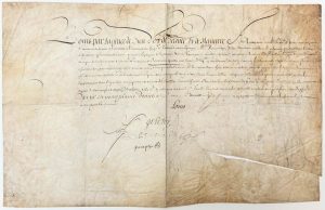 LOUIS XIV Roy de France et de Navarre. 1643. ORDRE DU SAINT ESPRIT. Pièce signée du Roi LOUIS XIV (Secrétaire) contresignée LOMÉNIE (sous la Régence de sa Mère Anne d'Autriche) . Ordonnance du Roi donné à Paris le dernier jour de Novembre 1643, «de payer au Sieur de RALLIÈRE Enseigne des Gardes du Corps de la Reine mère de Sa Majesté, la somme de 2400 Livres en considérations de ses fidèles services rendus. Nous lui avons fait et faisons Don par ces présentes signé de notre main, s'en quérir de ladite somme. Il lui soit aucune chose de suite rabattu pour le Cinquième et Dixième denier affectés à notre Ordre et Milieu du SAINT ESPRIT dont nous l'avons dispensé...»