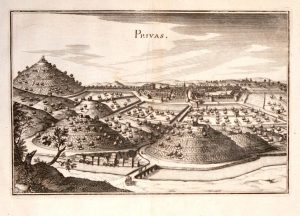 (ARDÈCHE.) Gravure de la Ville de «PRIVAS.» par Merian, vers 1650.