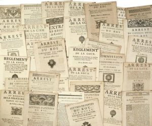 BRETAGNE. (ILLE-ET-VILAINE) RENNES, SAINT MALÔ. - 36 Arrêts de la Cour du Parlement de BRETAGNE imprimés chez VATAR à RENNES (35), (principalement), de 1663 à 1775, (Grand in-8°, déreliés.) savoir: «Arrest de la Cour de Parlement touchant les Dîmes. (sur la requête de François de Villemontré Evêque de Saint Malo.) 1663.» + «Arrest de nosseigneurs de la Cour de Parlement de Bretagne. En forme de règlement, concernant les salaires des recteurs & administrateurs des Fabrices. 1663» + «Extrait des registres du Conseil d'Estat du 9 Sept. 1673. Sur la requête de Balthazar Emery Me Chirurgien à S. Malo...» + «Commission à MM. de COETLOGON et Chamillart pour porter les Édits au Parlement de Rennes. 1673» + «Extrait des registres du Conseil d'État, en faveur des Cordeurs, Priseurs & Arpenteurs.» + «Extrait des registres du Conseil d'État, sur la requête de Jean Fauconnet Fermier Général des Fermes unis & Domaines de sa Majesté.» + «Arrest de la Cour qui confirme aux Curés la somme de 300 livres, & à leurs Vicaires 150 livres, suivant la Déclaration du Roy du 29 Janvier 1686.» + «Extrait du Conseil d'Estat du Roy. Portant qu'à l'avenir il sera levé & perçu sur les chardons à Drapiers & Bonnetiers, sortants du Royaume, dix livres de la Balle pesant 150 livres. 1689 + «Arrest de la Cour, rendu sur la remontrance de M. le Procureur général du Roy, concernant les Assemblées & Délibérations des Paroisses de cette Province.» 1689 + Arrest... du 23 Janvier 1691, concernant les Droits de Glandages, Pacages, chauffages & tous autres Droits d'Usages.» + Arrest... du 12 Février 1692 qui ordonne l'exécution de l'arrest du parlement de Bretagne du 18 déc. 1682, & que les Faux-sauniers de la Province de Bretagne poursuivis & arrêtés ès Provinces d'Anjou et du Maine, seront conduits ès prisons de ladite Province, pour estre leur procès instruit...» + «Arrest du Conseil d'État du Roy, concernant les Aveux des Saisies féodales. Du 12 May 1693» + «Ordonnance du Roy,... concernant la vente des Bleds (Blés) des 9 & 12 Sept. 1693» + «Arrest de la Cour, rendu sur les Conclusions du Procureur général du Roy, qui sursoit toutes les instances & Procès Civils des Gentils hommes servant actuellement Sa Majesté. Du 6 May 1695» + «Arrest de la Cour rendu sur les conclusions de Mr le Procureur Général du Roy, qui fait défenses aux Recteurs ou Curés d'interroger les Témoins qui se présentent à eux, pour mettre leurs noms aux Monitoires qui auront été publiés. 1696» + «Nouveau Tarif... portant règlement des Droits, Salaires et Vacations des Greffiers des Présidiaux & autres juridictions Royales, de la Province de Bretagne. Du 13 May 1698» + «Règlement de la Cour, rendu sur les Remontrances du Substitut de Monsieur le Procureur Général du Roy, concernant la Police générale. Du 17 nov. 1698» + «Règlement de la Cour, rendu sur les conclusions de Mr le Procureur général du Roy, enjoignant au Sénéchal & Substitut du Procureur général de RENNES de faire la visite des Maisons de cette Ville qui menacent de ruine, pour y pourvoir.» du 31 Déc. 1698 + «Arrest de la Cour... enjoignant à toutes personnes qui ont des grains en bernes de les faire battre incessamment...» 1699 + «Arrest de la Cour... qui règle les Droits qui doivent être perçus par les Greffiers, Notaires & Huissiers qui travailleront à la Réformation du Duché de Penthièvre. Du 31 Août 1699» + «Commission à Mr le Maréchal d'Estrées pour commander en Bretagne.» 1701 + «Arrest de la Cour concernant les Délibérations des Paroisses de la Provinces de Bretagne.» du 9 Déc. 1702 + «Arrest de la Cour qui juge les receveurs et administrateurs des Hôpitaux de RENNES, sont exempts de tutelle, curatelle, & nomination à icelles, & C.» du 30 Octobre 1711 + «Arrest de la Cour... qui ordonne que les Arrests & Règlements d'icelle concernant les délibérations & assemblées de Paroisses, l'administration des Biens de l'Église,... seront bien & dûment exécutés dans la Paroisse de Vallet, & C.» - du 28 May 1718 + «Arrest de la Cour du Parlement de Bretagne,..., qui supprime un Décret de l'Inquisition, daté du 16 Février & publié à Rome le 8 Mars 1718.» + «Arrest de la Cour... qui fait défenses à toutes personnes de faire des Magasins de Blés, à peine de cinq cents livres d'amende. 18 mars 1720 + «Lettres patentes du Roy, pour accorder à ceux qui feront rebâtir leurs Maisons dans la Ville de RENNES (incendiée) la faculté d'Emprunter au Denier vingt. 1722 + (Incendie de RENNES) «Arrest du conseil d'Estat du Roy, qui oblige les particuliers de RENNES de faire leurs Soumissions pour rebâtir, faute de quoi, sera procédé à la vente des emplacements.» du 12 Avril 1723 + «Arrêts et Règlements de la Police générale tenue au Palais du 3 mars 1724.» + «Arrest de la Cour... qui fait défenses à tous Juges de la Province de décerner aucune Commission rogatoire aux recteurs des Paroisses d'entendre les témoins...» 1727 + «Lettres patentes du Roy, sur Bulle, touchant le Concours des Cures de Bretagne.» 1741 + «Lettres patentes du Roi, portant continuation du Parlement de Bretagne, par les Officiers de ladite Cour. Du 9 Janvier 1766» + «... Délibération prise le 3 nov. 1762 par les Gens des Trois États de la Province de Bretagne, convoqués à RENNES,... d'emprunter...» + «Arrest portant suppression d'un Imprimé intitulé, Procédure de Bretagne ou Procès extraordinaire instruit & jugé, & c. du 11 mars 1770» + «Lettres patentes du Roi, pour l'exception du Droit d'aubaine aux Danois, adressées au parlement de RENNES.» 6 Juin 1772 + «Lettres patentes du Roi, portant établissement d'une caisse d'amortissement pour l'extinction des dettes de la Province de Bretagne.» du 11 Février 1775.»