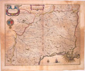 Carte XVIIe s.: «Languedocia, vulgo LANGUEDOC» (Rouergue, Albigeois, Gévaudan, Velay,...) Amsterdam, chez Guillaume Blaeu. (50 x 60,5 cm) Etat B.