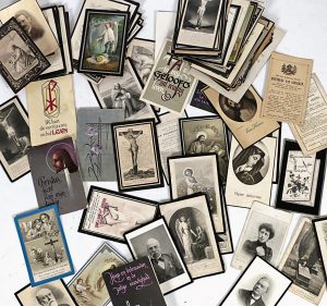 (Imagerie pieuse) — 292 images mortuaires à liseré noir et 4 faire-part de décès, 19e-20e s. Quasi toutes en noir, la plupart de 10,9 x 7,2 cm, plusieurs en double, la majorité en néerlandais, 3 avec dentelles mécaniques (rouss. ou us. sur...