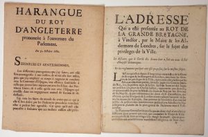 + «L'ADRESSE qui a été présentée au Roy de LA GRANDE BRETAGNE, à Windsor, par le Maire & les Aldermans de Londres, sur le sujet des privilèges de la Ville. Le Discours que le Garde des Sceaux leur a fait au nom de Sa Majesté Britannique. Et les règlements qui leur ont été proposés sur le même sujet.» Impr. à Toulouse chez Jean BOUDE, 1683.