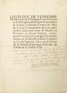Lettre autographe signée “Louis de VENDÔME” à l'entête imprimée de ses Nom et Titres. Il est ordonné au sieur de LAVAL de se rendre à MANTOUE pour y faire les fonctions d'Aide Major de ladite Place ... Donné à GUASTALLA (Italie) le 9 Février 1703. 1p in-4°.