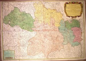 Carte de 1721: «Gouvernement général du LYONNOIS qui comprend les Provinces du Lyonnais, Forez, Beaujolais, Bourbonnais, Auvergne, et la Marche. Divisé en trois généralités, savoir celles de Lyon, de Moulins et de Riom. Et subdivisées par élections avec les provinces adjacentes. Dressé sur les mémoires les plus nouveaux par le Sieur JAILLOT Géographe ordinaire du Roi... , 1721» (73 x 103,5cm). État B.