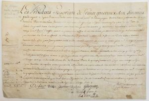MARNE. 1728. Lettre de réception de la Nomination faite par le Roi de l'Office de Conseiller Procureur des Eaux et Forêts de SAINTE MENEHOULD (51), donné à Me Pierre DRAGON Avocat, fait à Châlons le 8 Octobre 1728. Pièce signée «Les Présidents trésoriers de France, généraux des finance, grands voyers et juges ordinaires du domaine de la Généralité de Champagne». Parchemin timbré de la Généralité de Chaalons (23 x 35cm oblong)