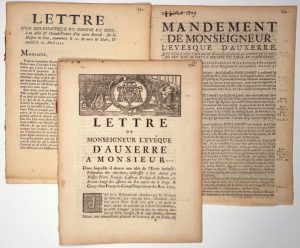 «Mandement de Monseigneur l'Évêque d'AUXERRE qui défend de réciter l'Office imprimé sur une feuille volante qui commence par ces mots: Die XXV. MA. In Festo S. Gregorii VII Papae et confessoris. 24 Juillet 1729.» «Lettre de Monseigneur l'Evêque d'AUXERRE à Monsieur... dans laquelle il donne une idée de l'Écrit intitulé: Réfutation des Anecdotes, adressée à leur Auteur par Messire Pierre Lafiteau Evêque de Sisteron, ci-devant chargé des affaires du Roi auprès du Saint Siège. A Gray chez François Couad Imprimeur du Roi. 1734. Auxerre 1er Février 1734.» «Lettre d'un Ecclésiastique du Diocèse de SENS, à un Abbé & Grand-Vicaire d'un autre Diocèse: Sur la Mission de Sens, commencée le 12 du mois de Mars, & Conclue le 6 Avril 1741. Sens 26 Avril 1741.»