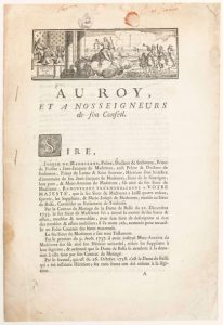 Requête au ROY et à nos Seigneurs de son Conseil concernant les héritiers sous bénéfice d'inventaire de feu Jean-Jacques De MADRIERES, Sieur de GUARIGUE, leur père (qui laisse 4 enfants Joseph de Madrières Prêtre Docteur de Sorbonne, prieur de Foissac, Jean-Jacques de Madrières, aussi prêtre & Docteur de Sorbonne, Marc-Antoine de Madrières Fils ainé & Marie-Joseph) - «...A ces Causes, SIRE, plaise à votre Majesté, casser et annuler l'Arrêt rendu en la troisième Chambre des Enquêtes du Parlement de TOULOUSE, le 22 Août 1740 (au sujet de la donation de la terre & Seigneurie de COLOMBIEZ (Colombiès 12) avec ses dépendances; du château de Guarrigue, & d'une somme de 9000 Livres... Les Titres & Papiers de la Succession du feu Sieur de Madrières, furent déposés chez un Notaire de Villefranche en Rouergue» Imprimé de 10 pp grand in folio avec très beau bandeau illustré; fait à PARIS; de l'imprimerie de P. PRAULT.