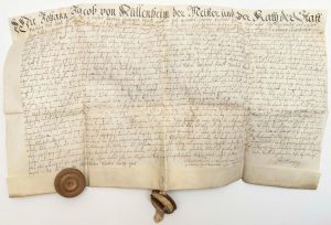 ALSACE. STRASBOURG (Bas-Rhin) Parchemin du 8 Août 1741. à l'entête de Johann Jacob de MÜLLENHEIM Bailli de la Place de Strasbourg (Ancienne famille noble de Strasbourg). Texte en allemand concernant un contrat de rente, d'Anna Elisabeth Honnerin, épouse Rollin, établie par le Conseiller du Roi, trésorier de la chancellerie établie près le Conseil Souverain d'Alsace. Pièce portée sur l'inventaire de feu M. Frédéric François PLARR Fils à Strasbourg le 2 Mars 1822.
