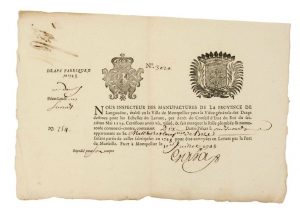 HÉRAULT. DOUANE. 1748. Pièce signée de l'Inspecteur des Manufactures de la Province de LANGUEDOC, établi en la ville de MONTPELLIER pour la visite des Draps destinés pour les Échelles du LEVANT, par Arrêt du Conseil du Roi du 16 mai 1714. MONTPELLIER (34) le 10 Juillet 1748. Certifions avoir vu, visité, et fait marquer la Balle plombée et numérotée, contenant 10 demi-pièces de Londrines (Draps)... pour être envoyée en levant par le port de MARSEILLE. 2 Vignettes (Royale et Languedoc). 1p (24 x 35), Imprimé rempli à l'encre.