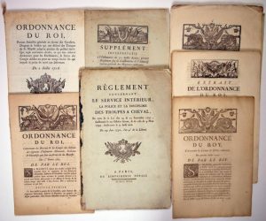 + Extrait de l'Ordonnance du Roi, pour régler le service dans les Places & dans les quartiers.» du 1er Mars 1768. Impr. 57pp in-folio + «Extrait de l'Ordonnance du Roi, concernant les Régiments Provinciaux» Impr à AIX (13), chez Esprit David, Imprimeur du roi & de M. l'Intendant, 1775; 26pp in-folio. + «Ordonnance du Roi, portant Amnistie générale en faveur des Cavaliers, Dragons & Soldats qui ont déserté des troupes de Sa Majesté jusqu'au premier du présent mois: Qui règle entr'autres choses, ce qui sera observé dorénavant pour les Enrôlements, la forme des Congés absolus ou pour un temps limité: Et qui impose la peine de mort aux déserteurs. Du 2 Juillet 1716.» Impr. à PARIS, de l'Imprimerie Royale, 1769; 19pp in-folio.