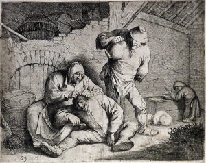 (École flamande) — 12 eaux-fortes, 16e-18e siècles. Femme épouillant un jeune homme. [D'après Adriaan BROUWER (1605/6-1638)]. 15,3 x 19,3 cm (rognée, collée en plein sur papier de support).— GALLE, Philippe (1537-1612).- Dieux et déesses...