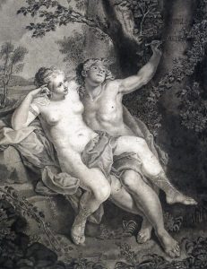 Évocation d'une scène du "Roland furieux" de l'Arioste : les amoureux sont assis au pied d'un arbre sur lequel le soldat sarrasin marque leurs noms. Dessin anonyme de qualité dans la mouvance des Coypel. Grande feuille en bel état.