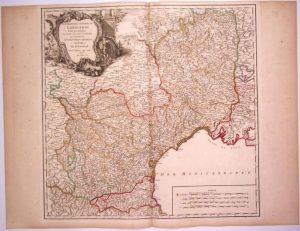 Carte: «Gouvernement général du LANGUEDOC divisé par Diocèses, avec les pays voisins de la Catalogne, qui comprennent les Gouvernements généraux de FOIX et de ROUSSILLON, par le Sr Robert Géographe Ordinaire du Roi, 1752.» (51 x 66 cm) État B.